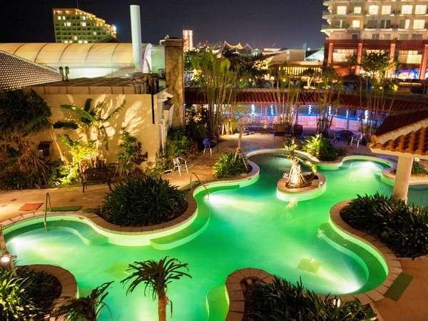 [プール]夜はライトアップされたヒーリングプールがとても綺麗...